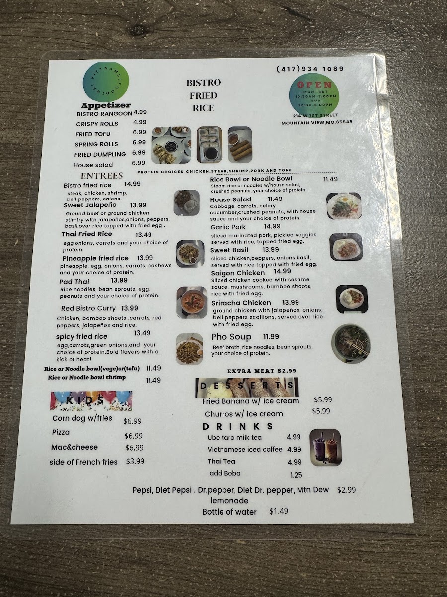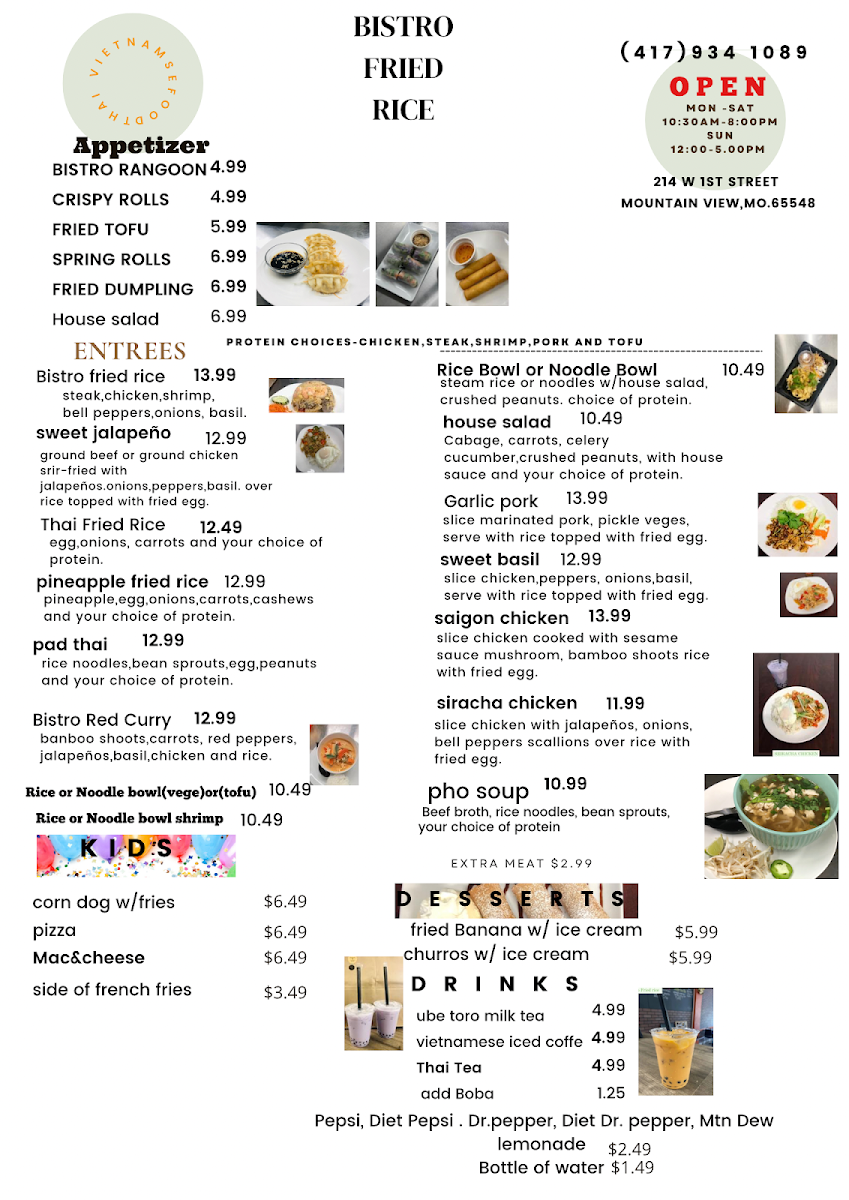 Welcome to Bistro Fried Rice, a delightful culinary gem located at 214 W 1st St, Mountain View, MO. This charming restaurant specializes in Thai-inspired cuisine, offering an inviting menu that showcases bold flavors and generous portions. The fried rice, a standout dish, embodies the essence of authentic Thai cooking, crafted by an experienced owner and chef known for her delicious prowess.